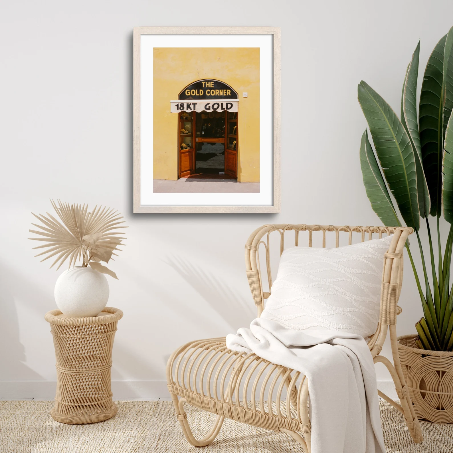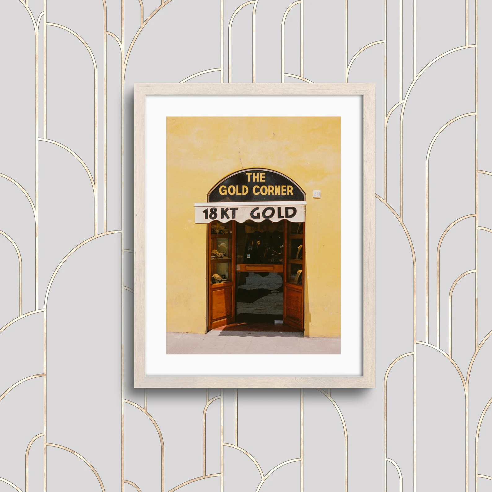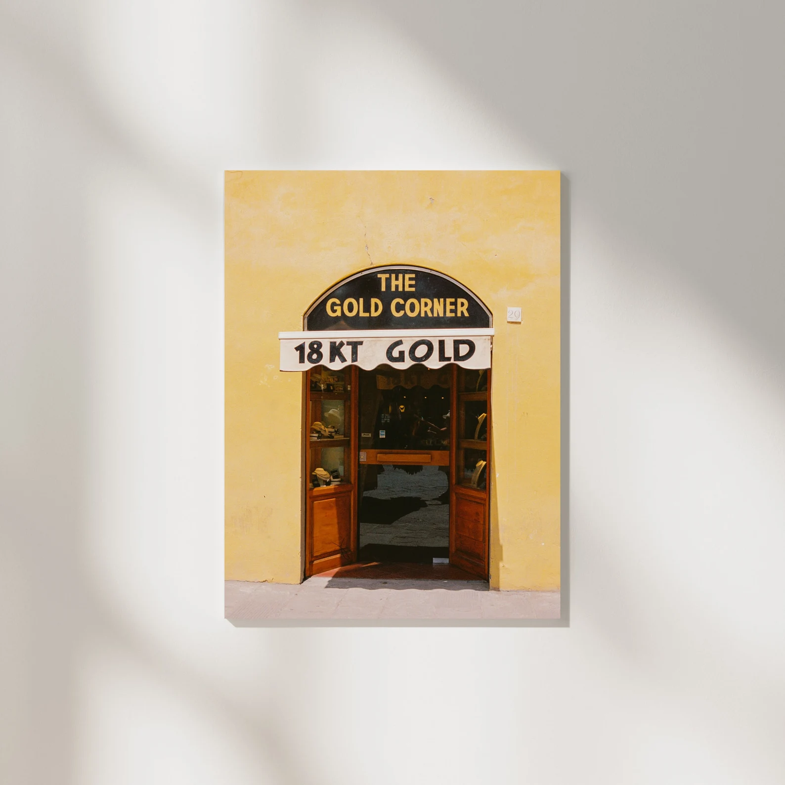 Gold Corner captures the warm tones of an Italian 18KT gold jewelry shop set against a sunlit yellow facade. Photographed on 35mm film, this fine art print highlights the charm of European storefront architecture and Mediterranean travel.